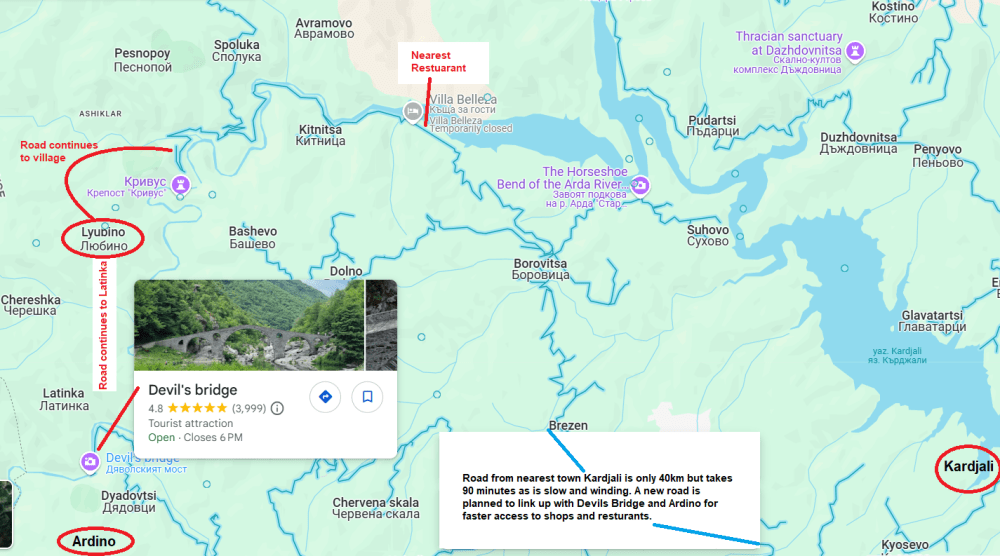 Village Lyubino, south Bulgaria. The nearest town is Kardjali, with daily market, big supermarkets, restaurants, chemists, vets, petrol stations, schools, hospitals and banks, The journey takes 90 minutes as the mountain road is slow going but scenic. There is new asphalt all the way to the village and this continues on for another 10k to the last village, Latinka. Here you can walk 30 minutes down to Devils bridge. A new road and bridge is planned to link to the Obshtina town Ardino, on the south side of River Arda, making it a much quicker trip to the shops. There is a daily bus to Kardjali from the next village, Dolno Spoluka, 7km away.