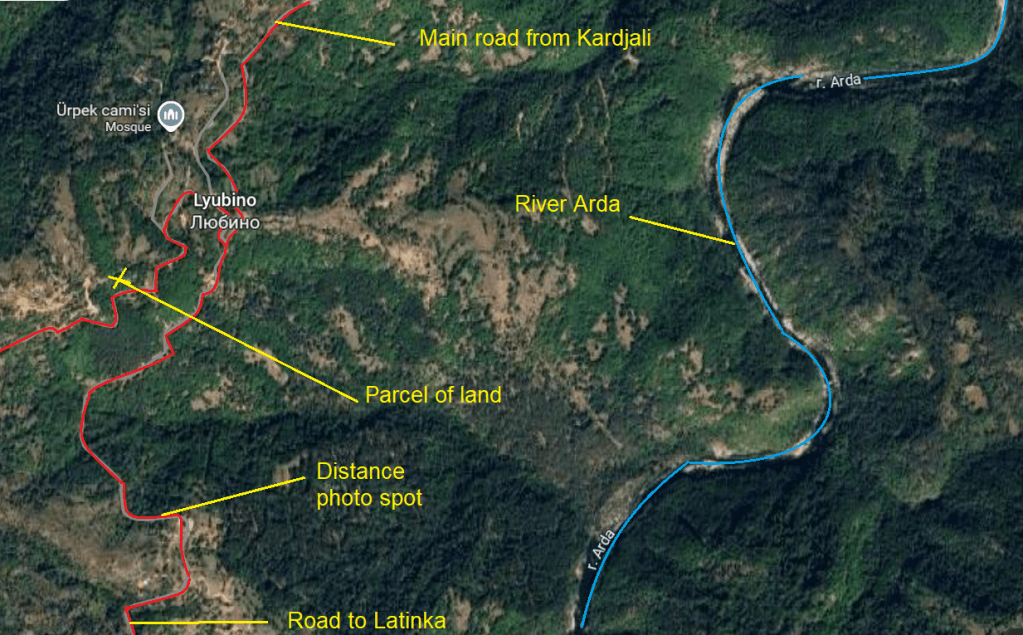 This map gives a birds-eye view of the parcel location. The elevation of the parcel is about 800m. Below is the river Arda.