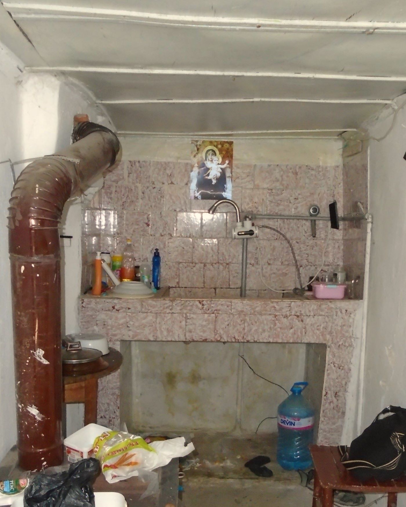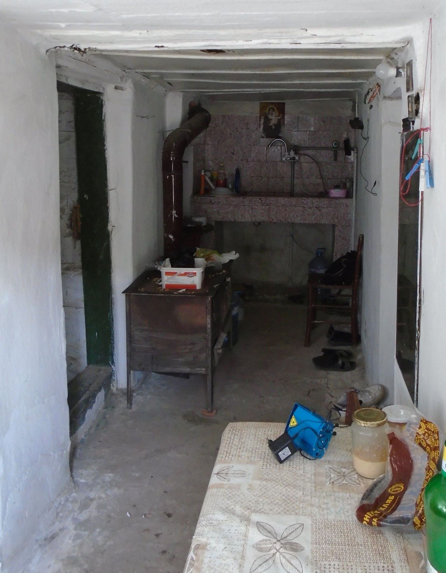 Enter into a central room with large sink area and on-demand hot water boiler. Heating and cooking by wood burner. Village water and electricity supplied.