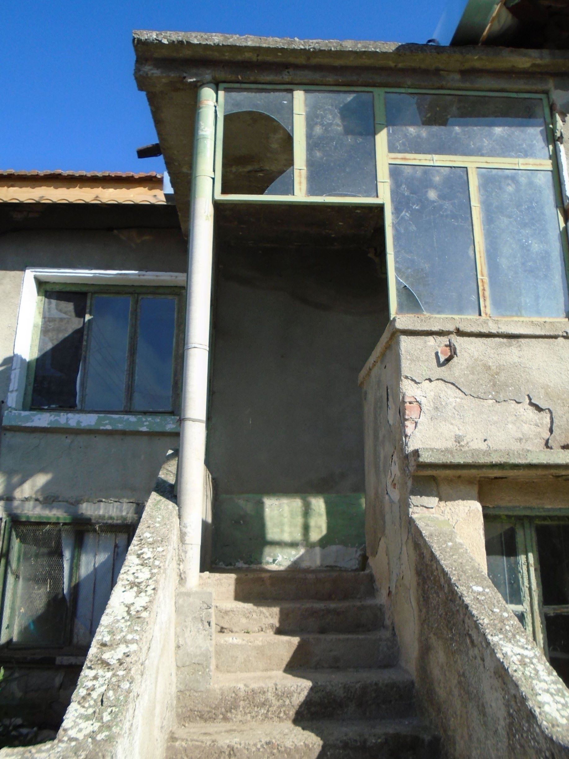 Steps lead to floor 2 double doors and a central corridor. The new roof is visible as here the ceiling hasn’t been replaced yet.