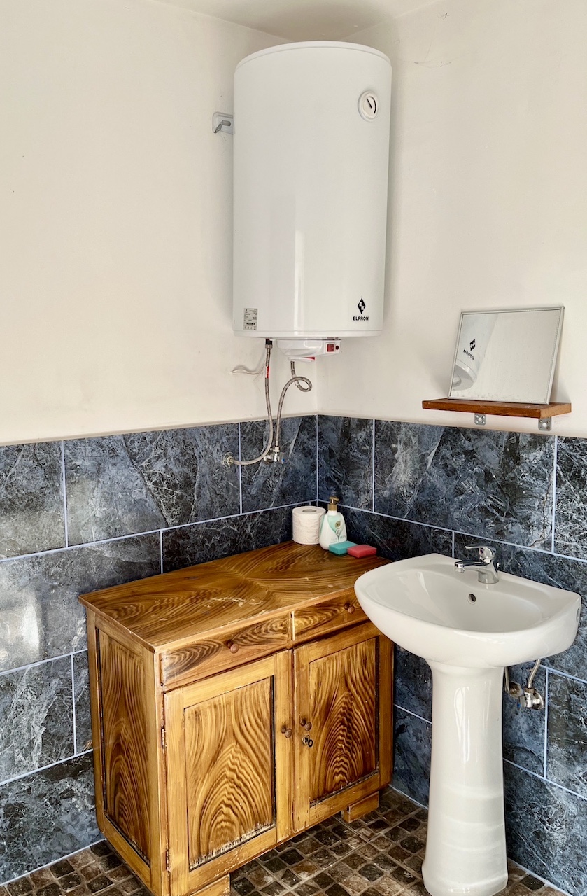 The tiled wet room with toilet has a separate shower and a bath. Hot water provided by electric boiler.