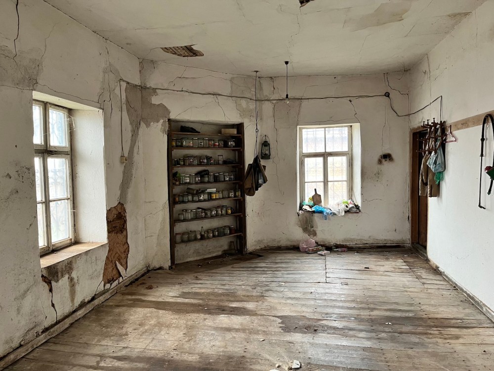 Here you can see the old doorway has been covered internally with wooden shelves. The floor is original wood and still has the trap door to the cellar.