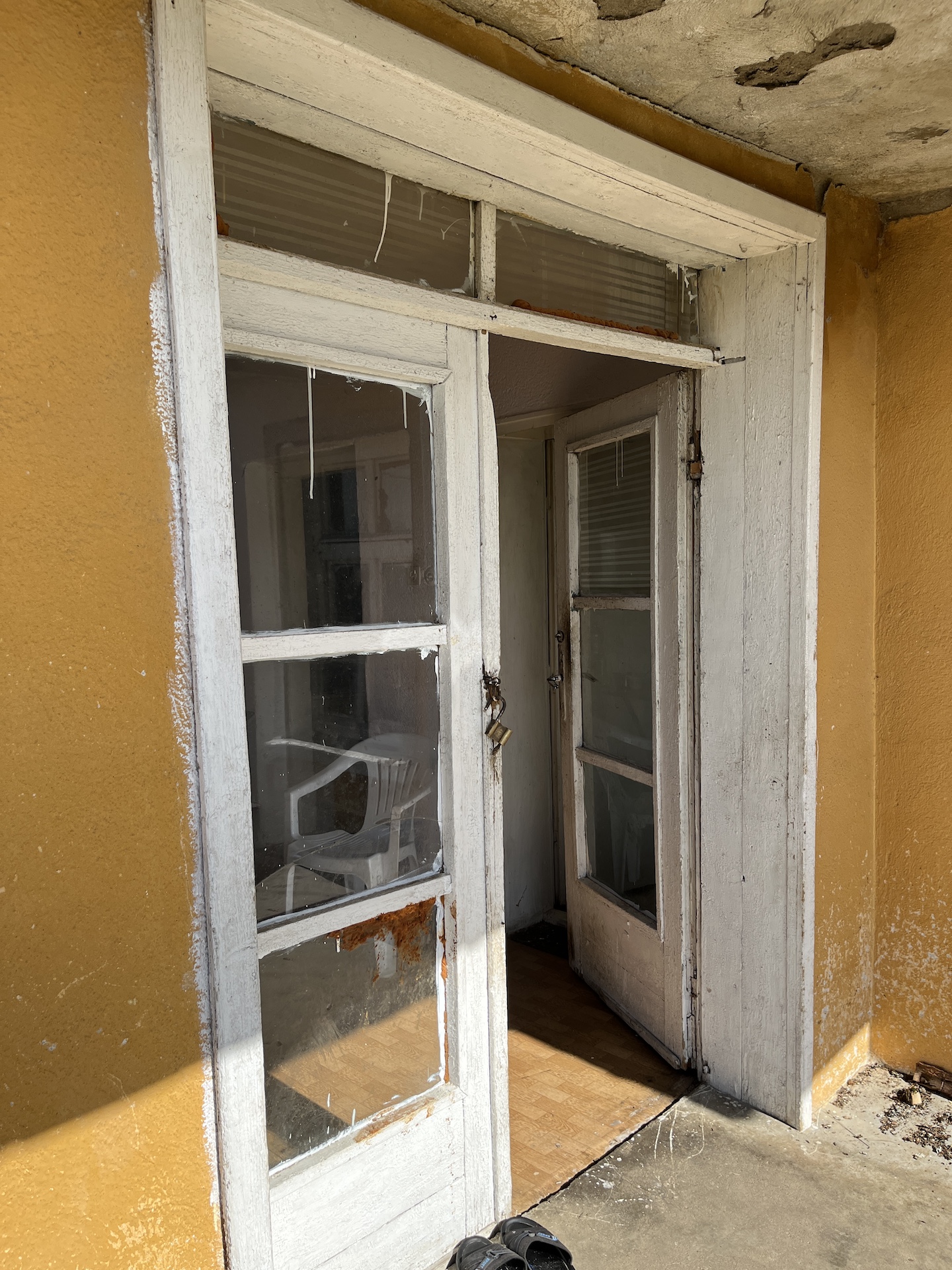 The L shaped house has external stairs and the main living area is on the 2nd floor. The roof has been improved and all leaks stopped except a small one, where the flat roof joins the main roof.