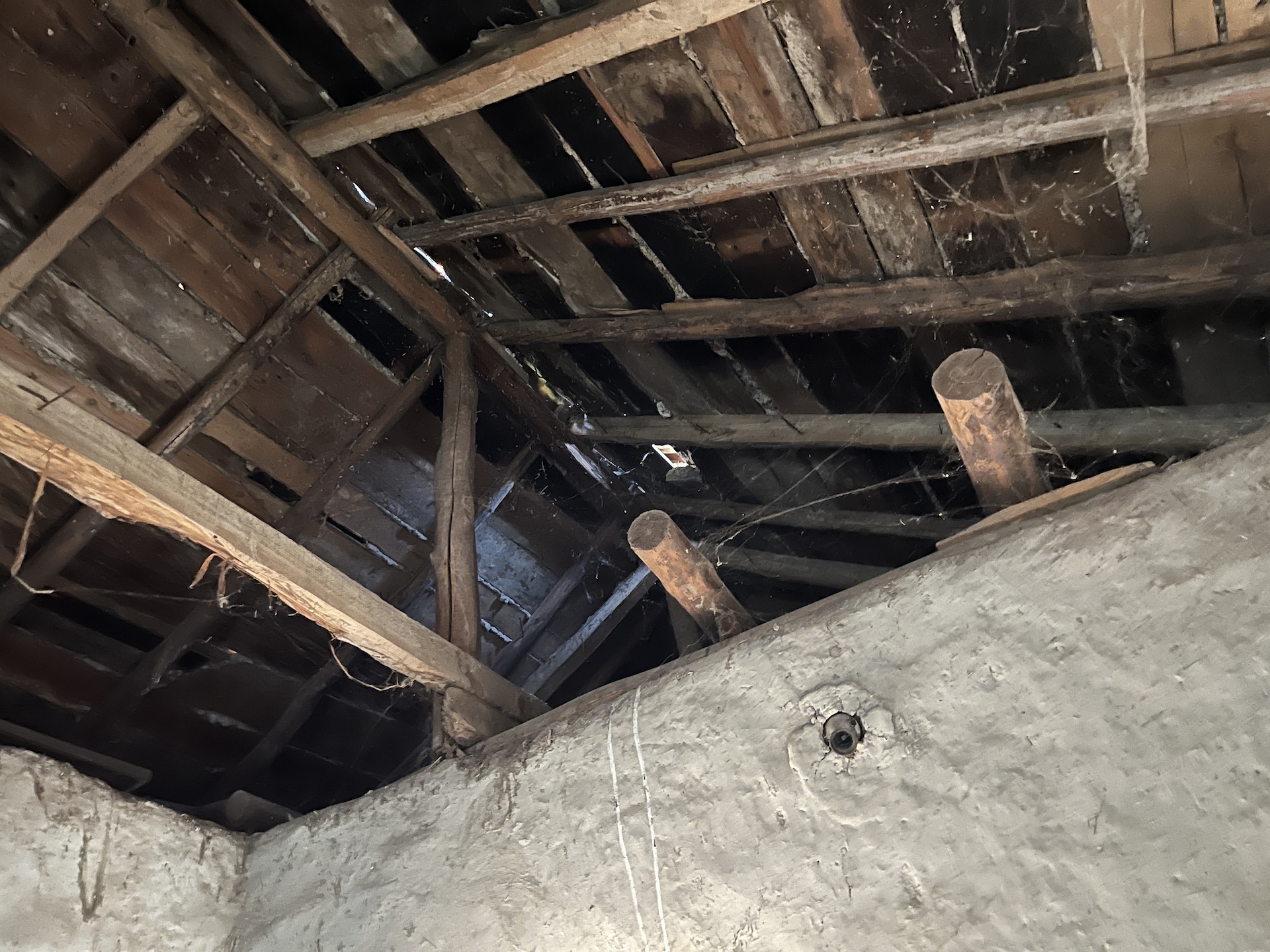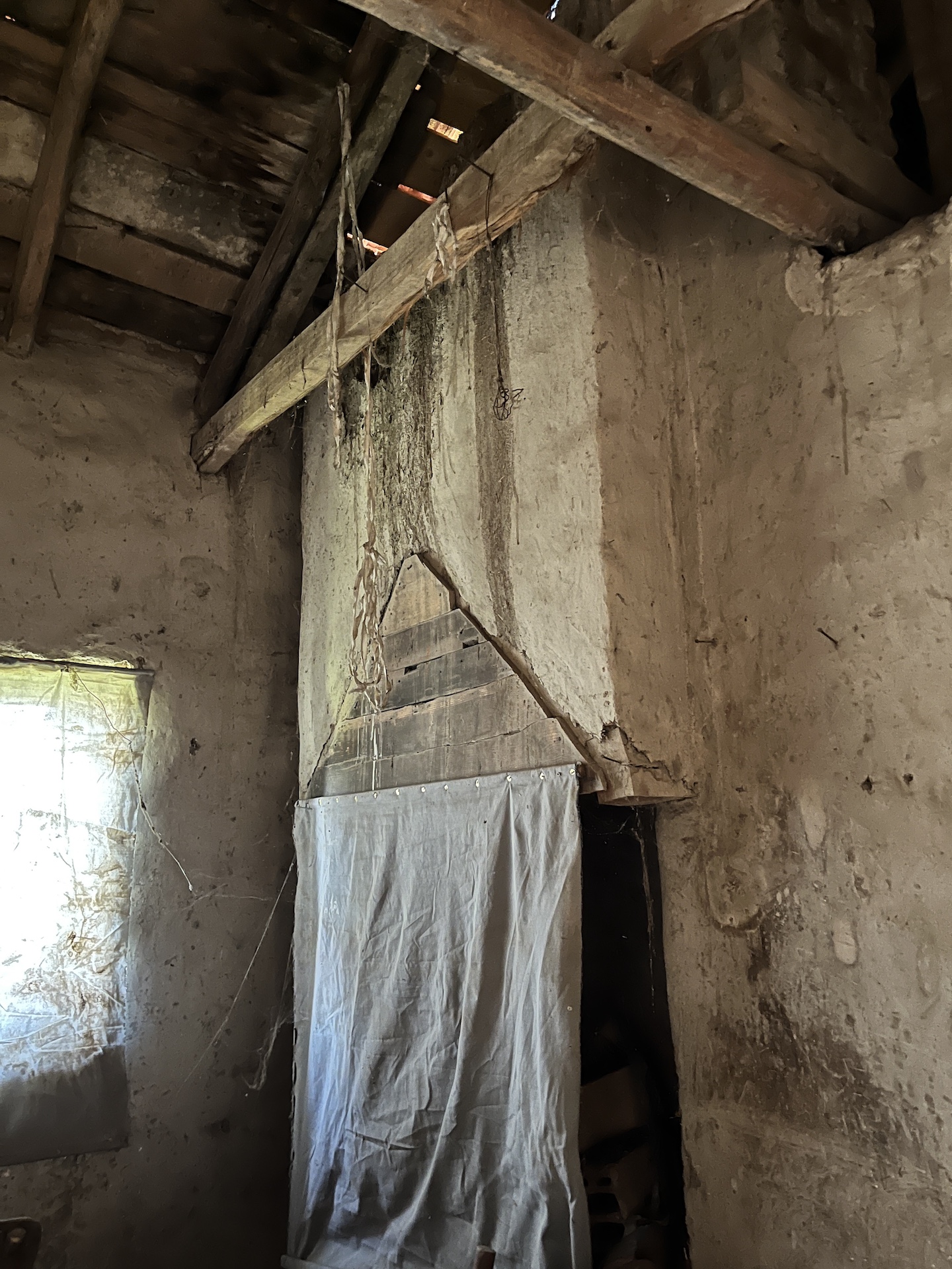 South facing, both bedrooms at the front have double corner windows making them light and airy. The rear room is unfinished, still has an earth floor, a large fireplace and no ceiling so you can see up to the roof.