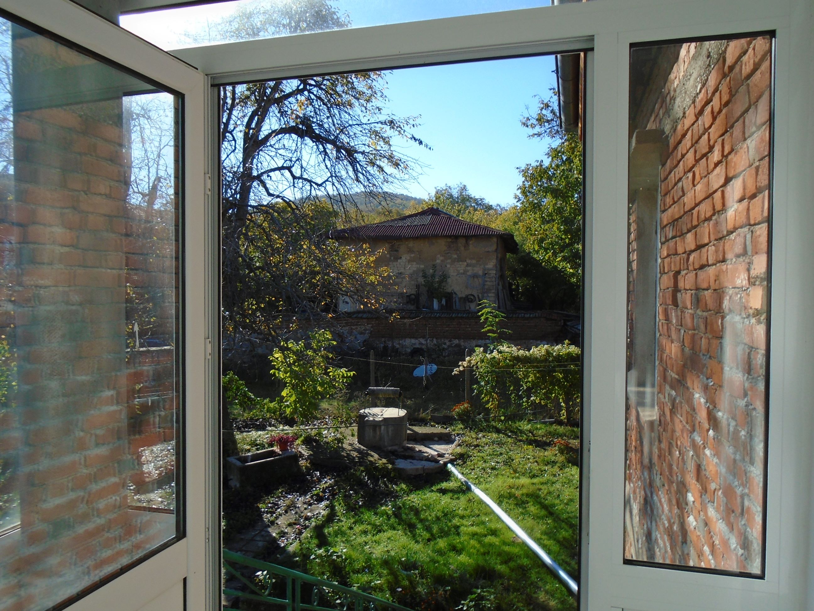 From the top of the external steps you can see the Eastern Rhodope Mountains in the distance. The front door opens into a conservatory overlooking the garden.